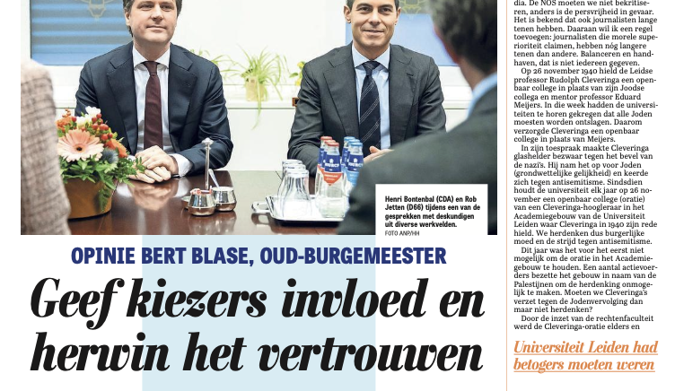 Op 2 december 2025 publiceerde De Telegraaf in de rubriek ‘De Kwestie’ een opiniebijdrage van oud-burgemeester Bert Blase. In zijn stuk gaat Blase in op het dalende vertrouwen in de politiek en doet hij een krachtige oproep om inwoners meer directe invloed te geven.